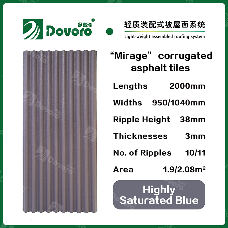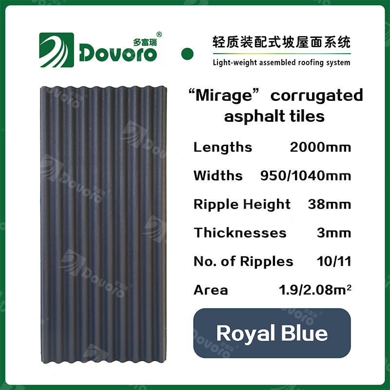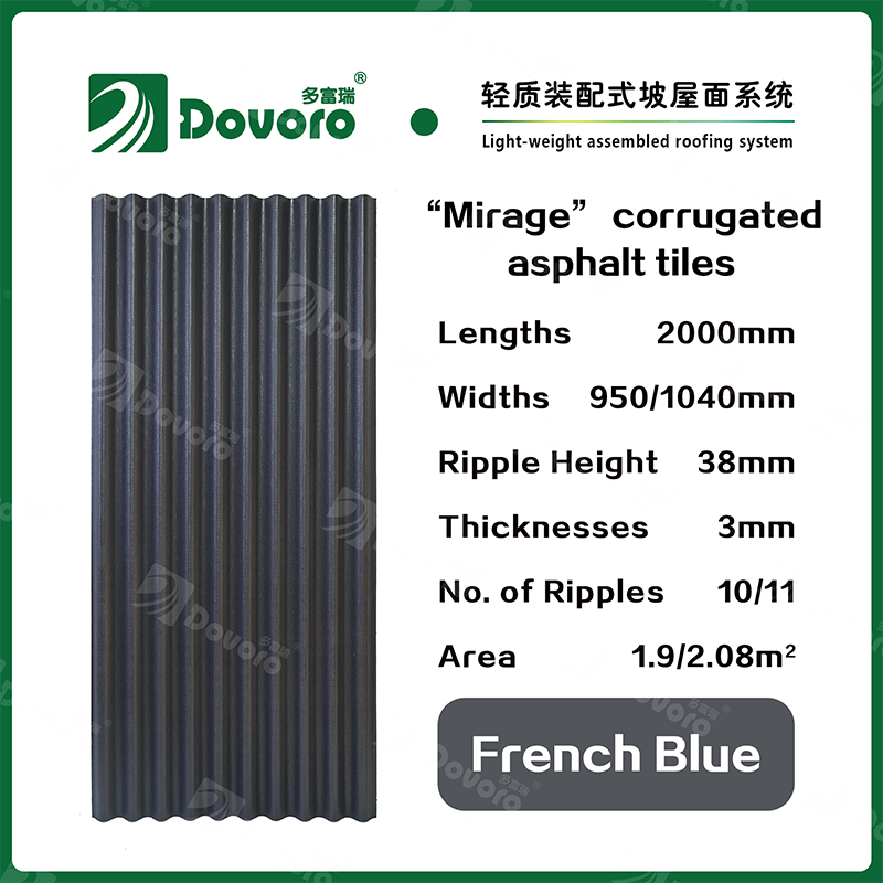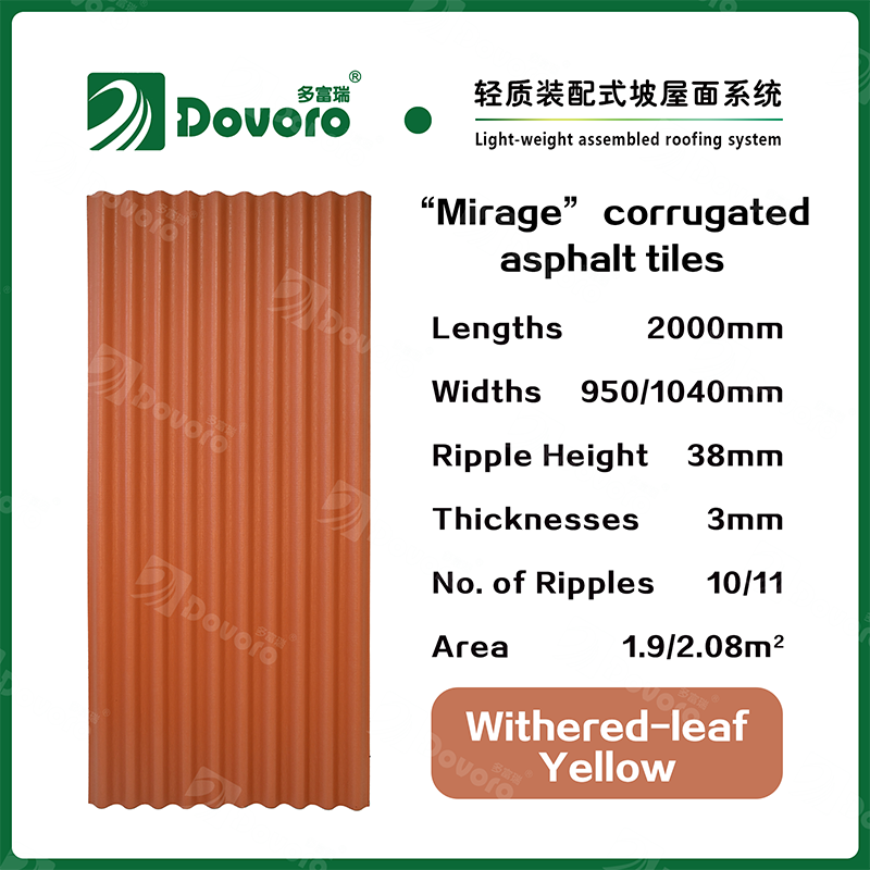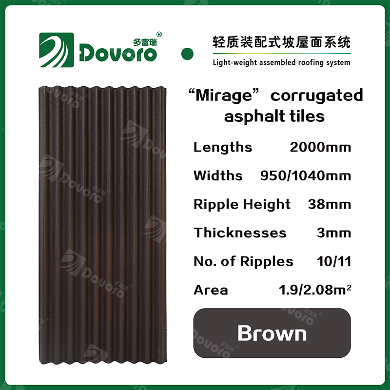 - Dovora “Mirage” corrugated asphalt tile is made of mineral plant fibers soaked in asphalt under high temperature and pressure. The tile is more solid overall and has strong toughness. And the thermosetting resin maintains strength of tiles;