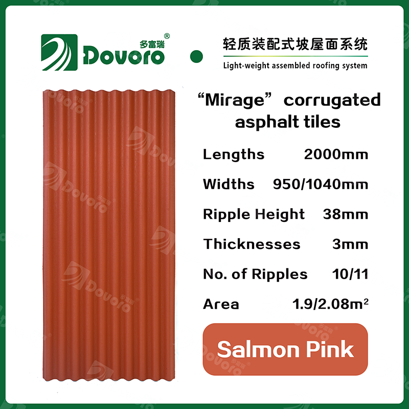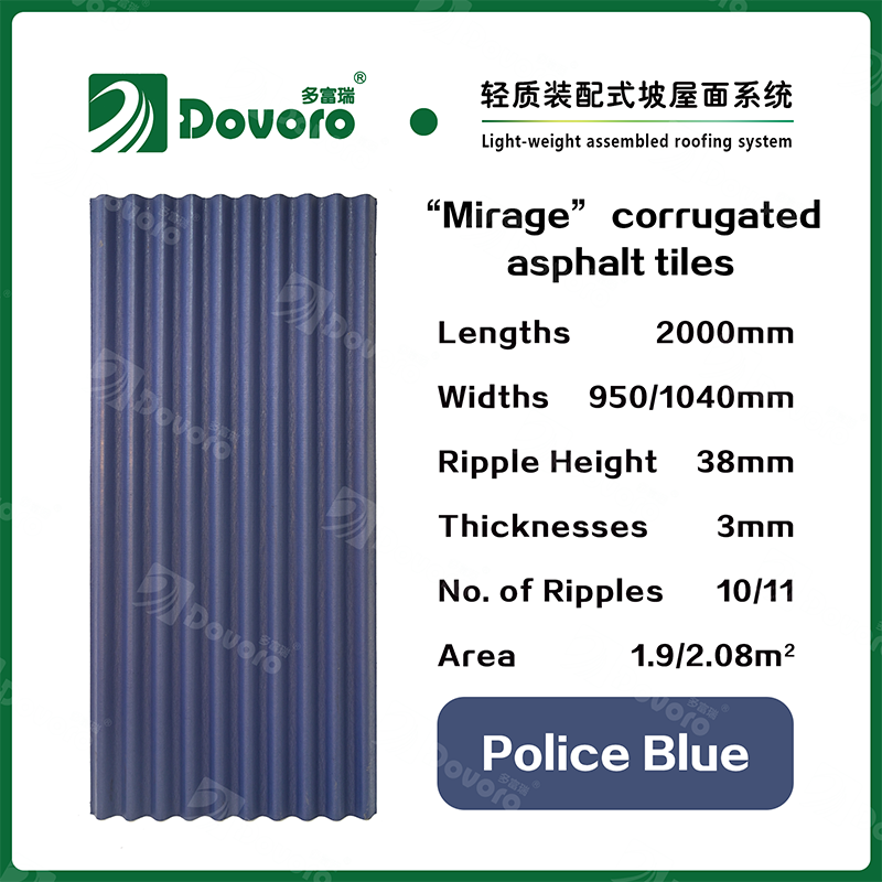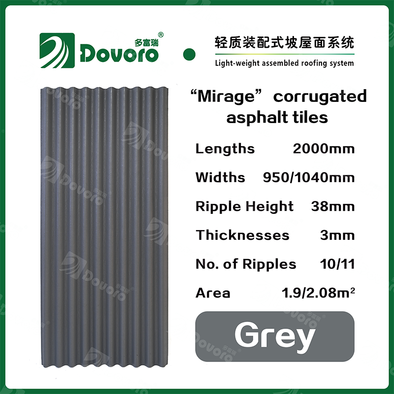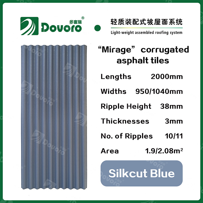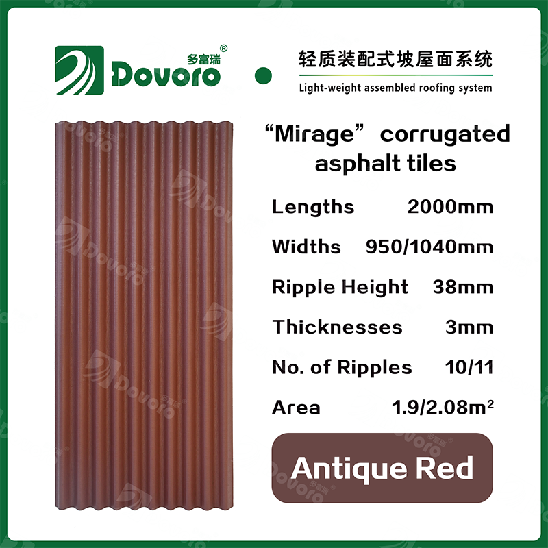 - Dovora “Mirage” corrugated asphalt tile is made of mineral plant fibers soaked in asphalt under high temperature and pressure. The tile is more solid overall and has strong toughness. And the thermosetting resin maintains strength of tiles;
