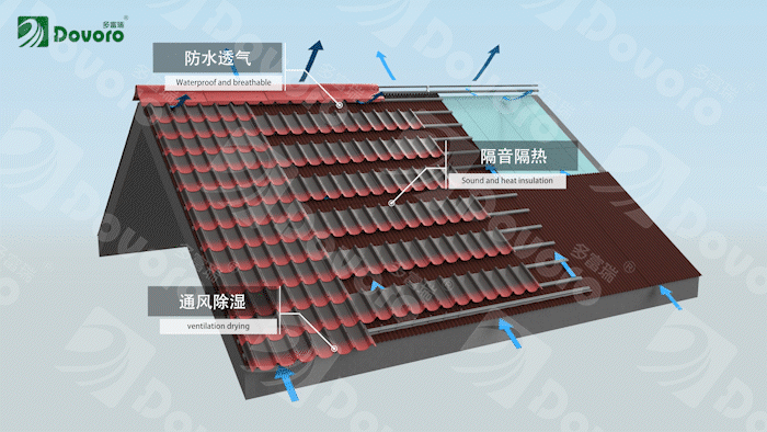 波形瀝青防水板與瓦材的雙層結構,形成了可以供空氣自由流通的空間。利用空氣導熱性能弱的特性,使最上層屋面瓦材的熱量不容易傳遞至室內,流通的空氣可以帶走屋面系統中的熱量,為瓦材降溫。降低屋面瓦材的高溫負擔,延長屋面壽命。