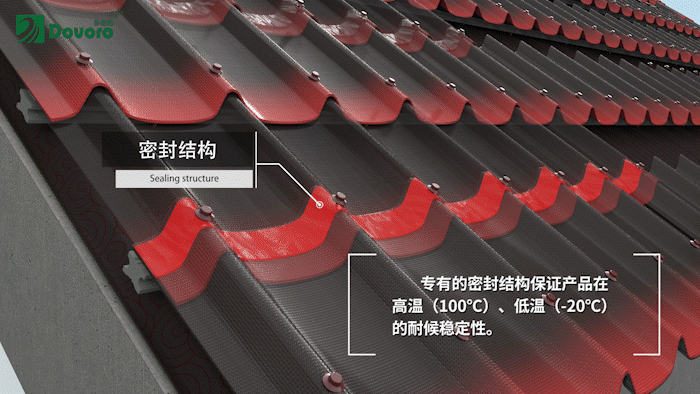 多富瑞2.0系列的產(chǎn)品,波形瀝青防水板和波形瀝青瓦的一側(cè),新增了全新的密封結(jié)構(gòu)。特制的瀝青膠條具有良好的耐候穩(wěn)定性,在高溫100℃與低溫-20℃間性能穩(wěn)定。