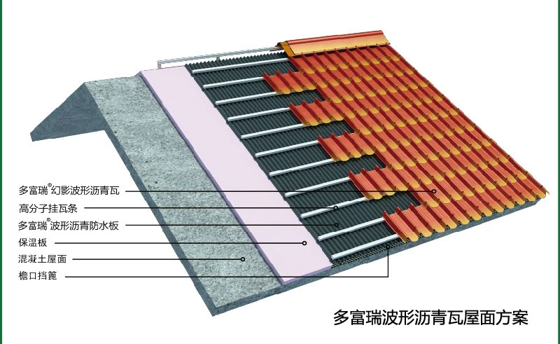 防水板是由植物纖維、礦物纖維和瀝青結(jié)合而成的復合新型波形防水材料,除自身具備防水性能外,還起到通風、除濕等輔助作用,最重要的是在不影響自身性能的前提下把混凝土基層、保溫層和屋面瓦快速有效地整合起來。